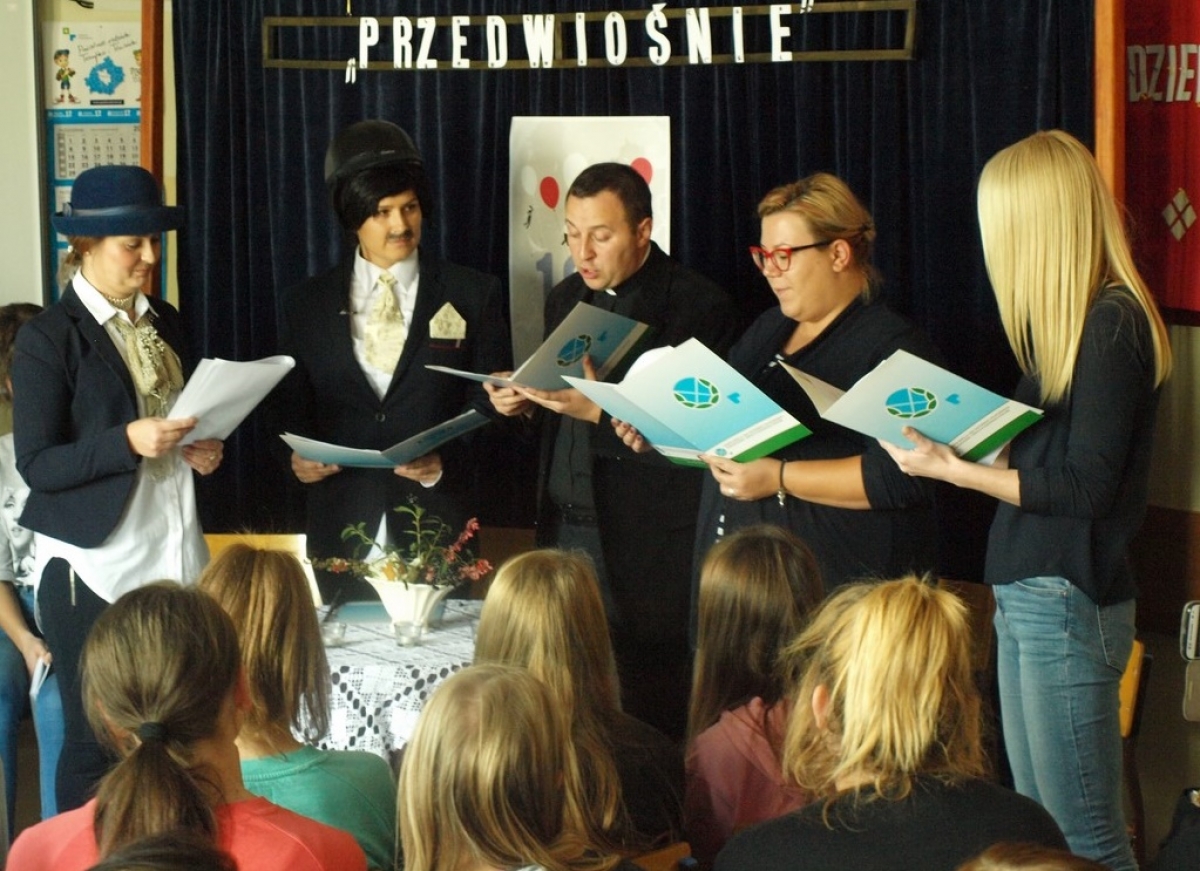 Dla szkolnej społeczności czytały panie: Małgorzata Krzysztoń, Joanna Białachowska, Weronika Hańczyk,  Agnieszka Ludwiszewska, które w pięknych przebraniach przedstawiły scenę  spotkania Laury i Cezarego.  W rolę narratora  tejże  sceny,  wcielił się  ksiądz Waldemar Myka. Do wspólnego czytania włączyli się również nasi odważni  i utalentowani uczniowie: Joanna Budych, Klaudia Ludzkowska, Romka Surdyk, Weronika Pasturczak, Bartek Kwiatkowski, Paweł Stocki, Karolina Witkowska, Dagmara Głuszek, Magdalena Woźniak, Jeremiasz Szulc.
