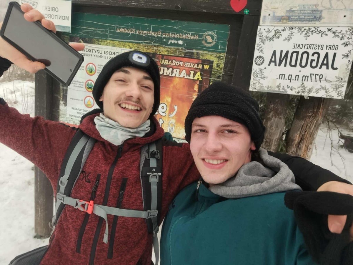 Każdy uczestnik otrzymał dodatkowo własną koszulkę z nadrukiem i w barwach szkoły, a także płaszcz przeciwdeszczowy, co budowało wspólnotowy klimat i było praktycznym wsparciem podczas zajęć w terenie. Podczas wędrówki na Jagodną uczniowie odwiedzili schronisko, gdzie czekała na nich zimowa herbata, idealna na regenerację i integracyjne rozmowy po górskim podejściu.